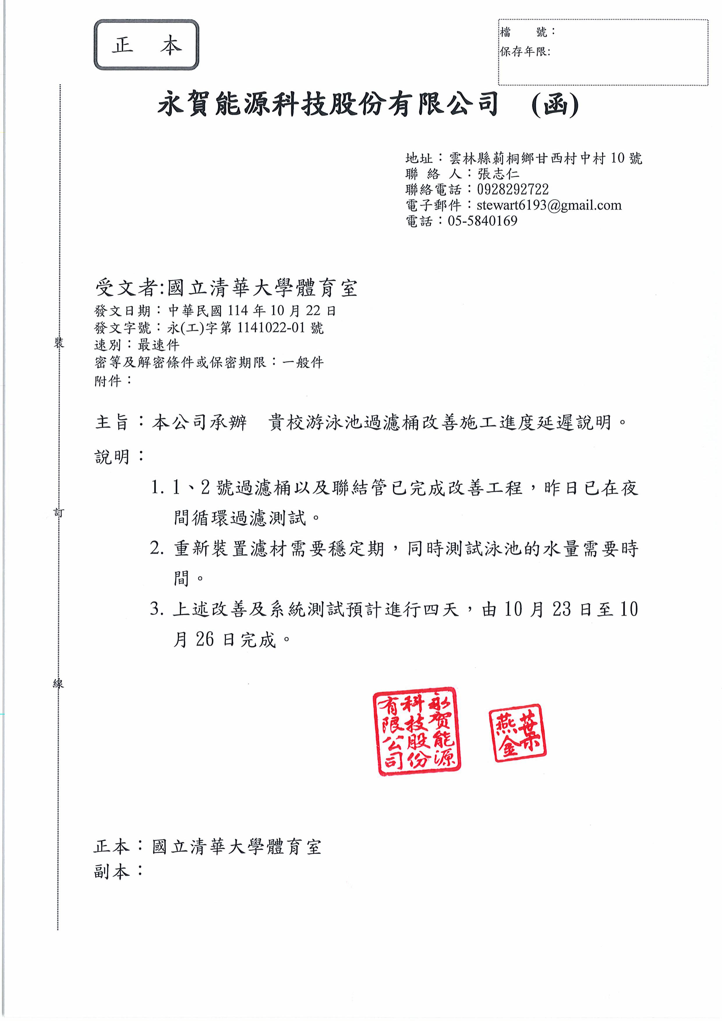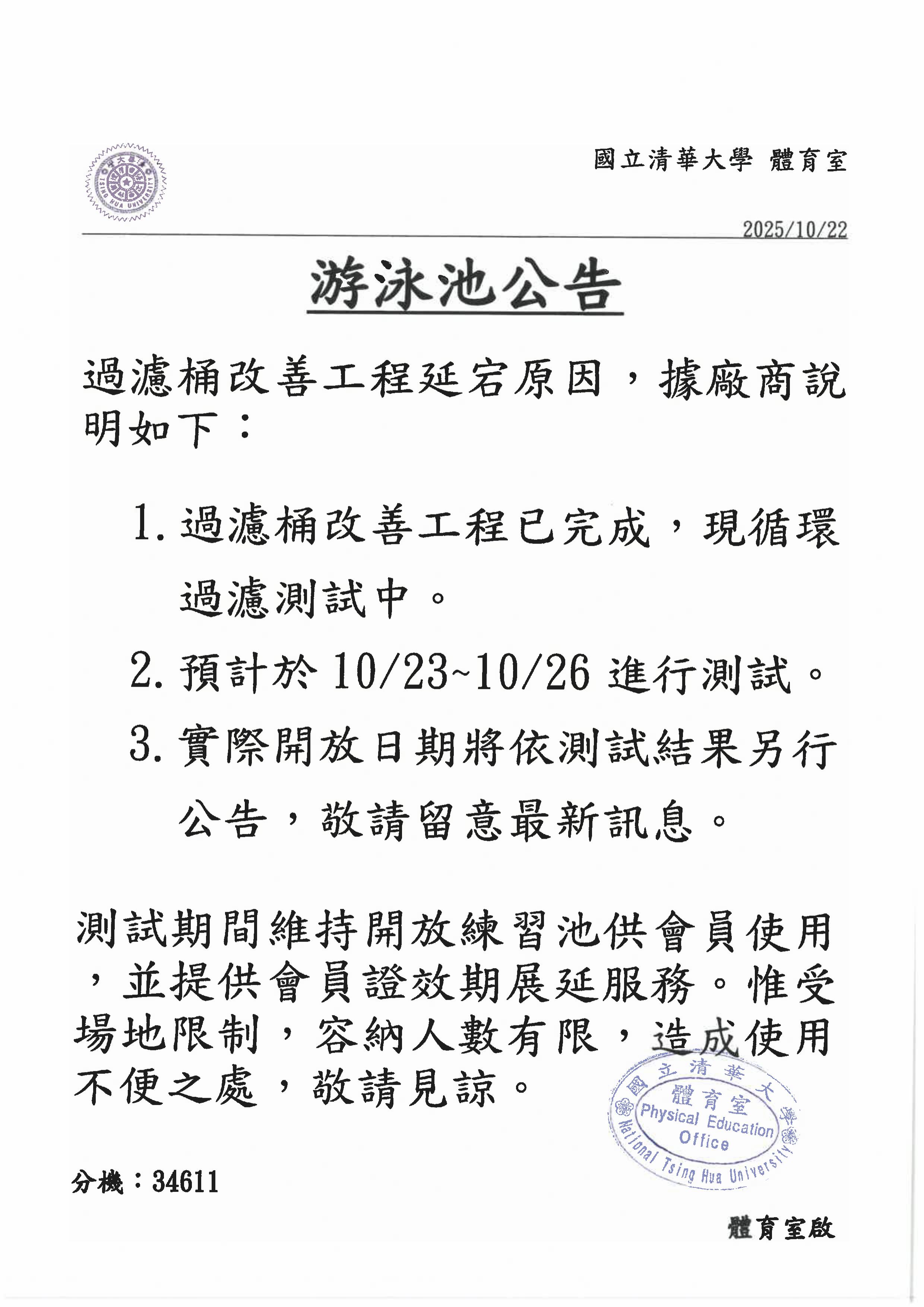 【游泳池】泳池水質混濁度未達理想改善效果,將調整泳池開放方式;維修進度說明(10/22)